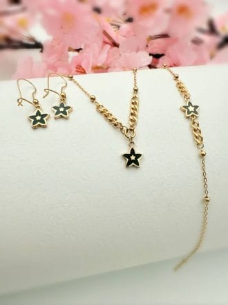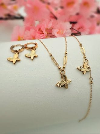 وزن دستبند: 0.350 سوت ,وزن کل: 1.310 گرم ,وزن گردنبند: 0.520 سوت ,وزن گوشواره: 0.44 سوت |